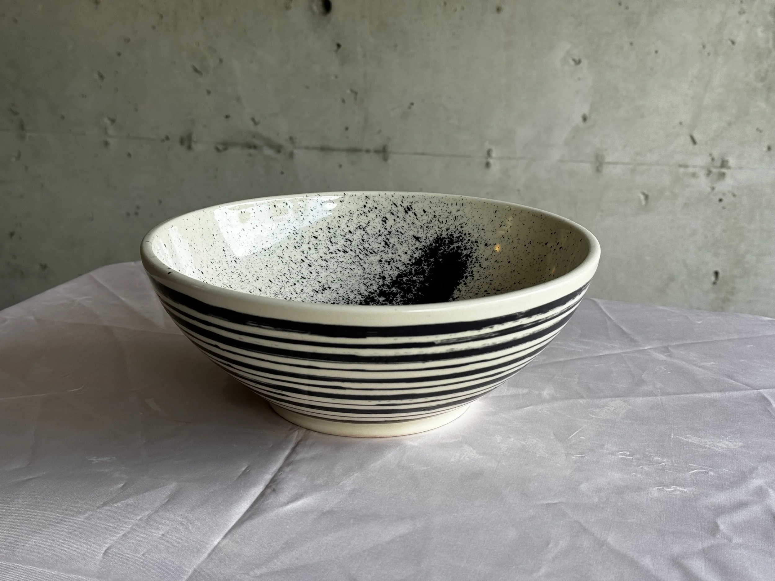 This set of pieces was thrown with American Porcelain and decorated with black slip. The black slip produces high contrast with the stark white of the clay body. The decorations are chaotic and elegant at the same time by including both long breaking strokes, but also splashes and streaks of thrown stain. The pieces decorated with this method begin as highly technically and precise forms, creating contrast between the form's precision and chaotic decoration. Strokes of black slip are inspired by Chinese calligraphy, and the artist’s Chinese heritage.