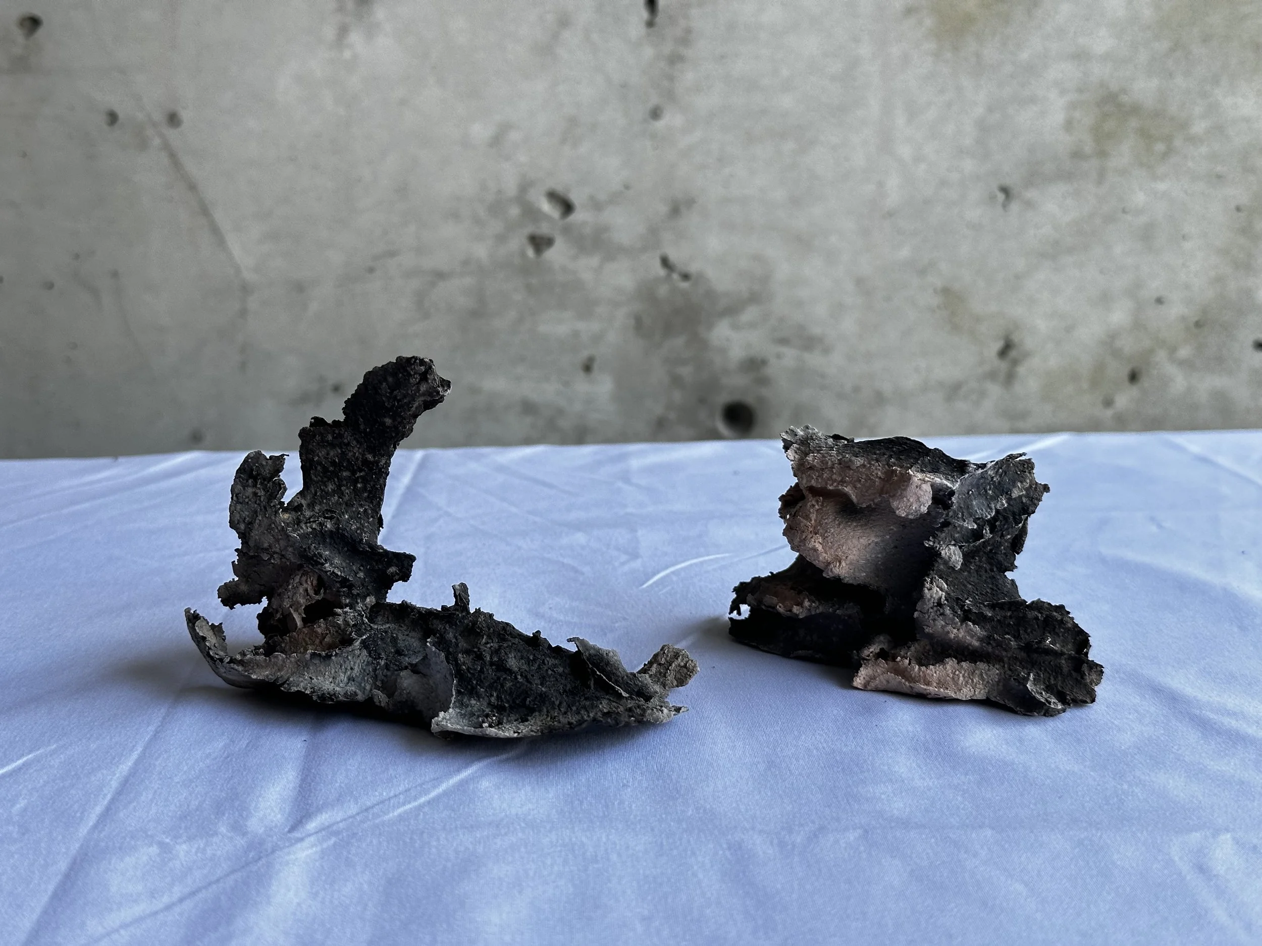 This small urn shaped vessels was staged next to another while being shot at. This vase is cratered with fragments from another vase nearby, while also being grazed by a bullet from a 22 LR rifle.