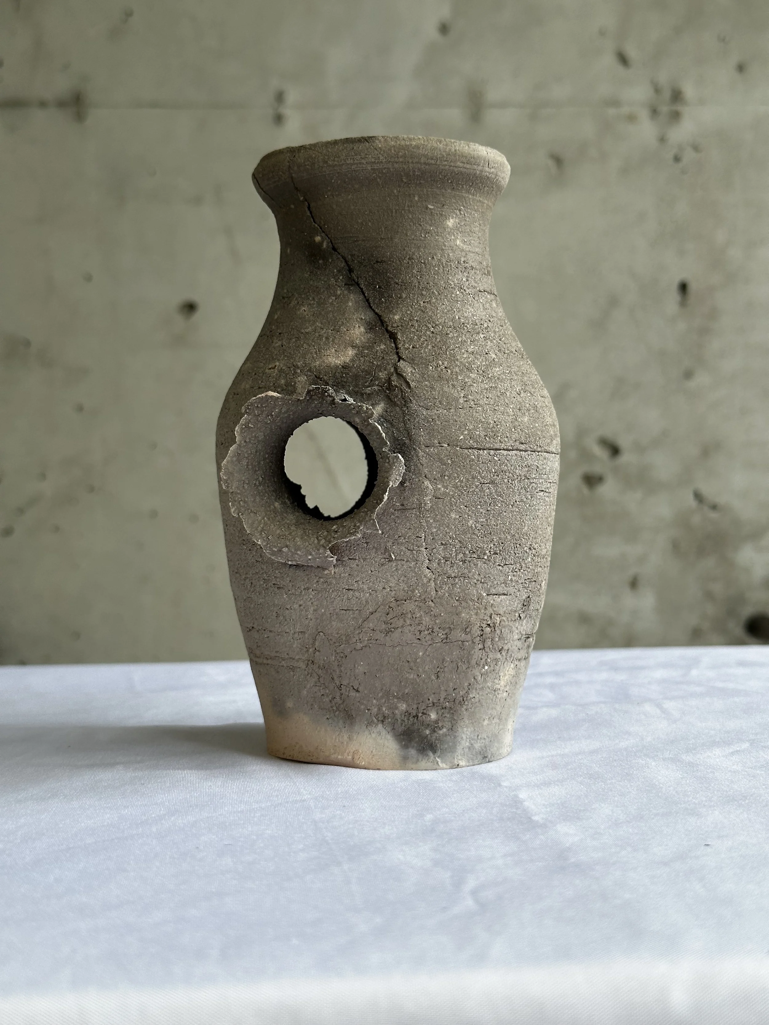 A small urn shaped vessel that was shot three times with a 22 LR rifle. The vase has distinct entrance wounds, but one singular large exit wound.