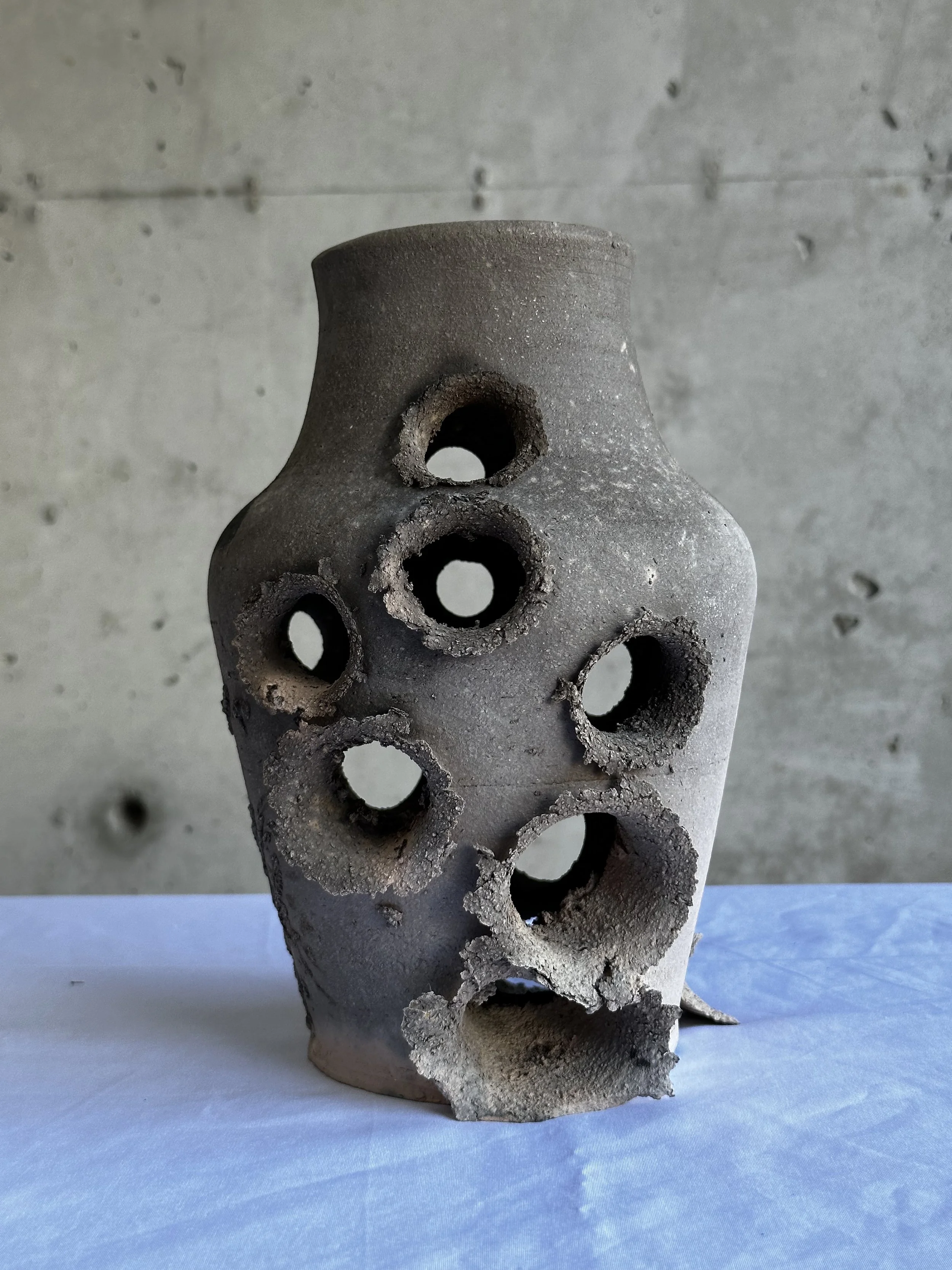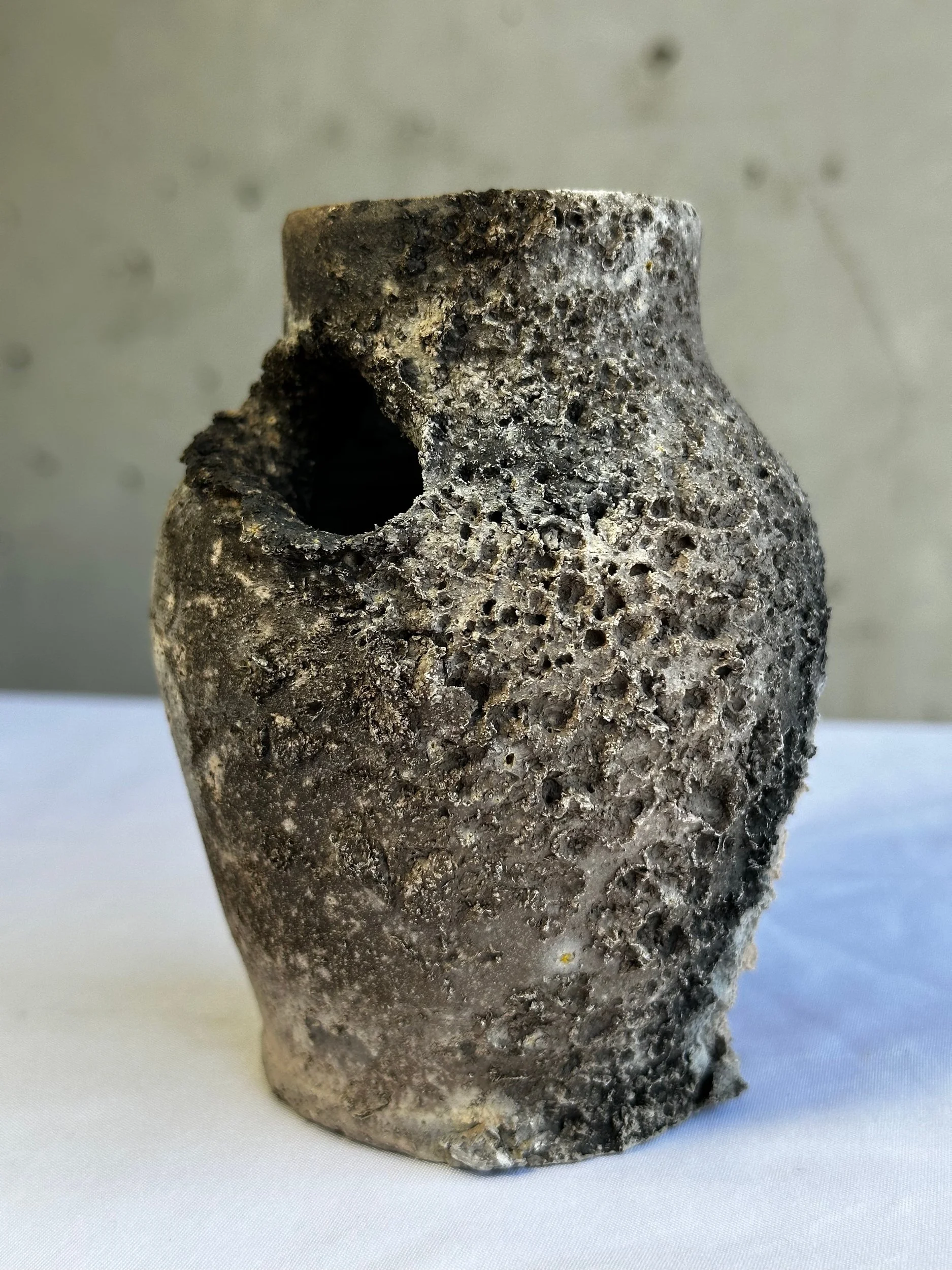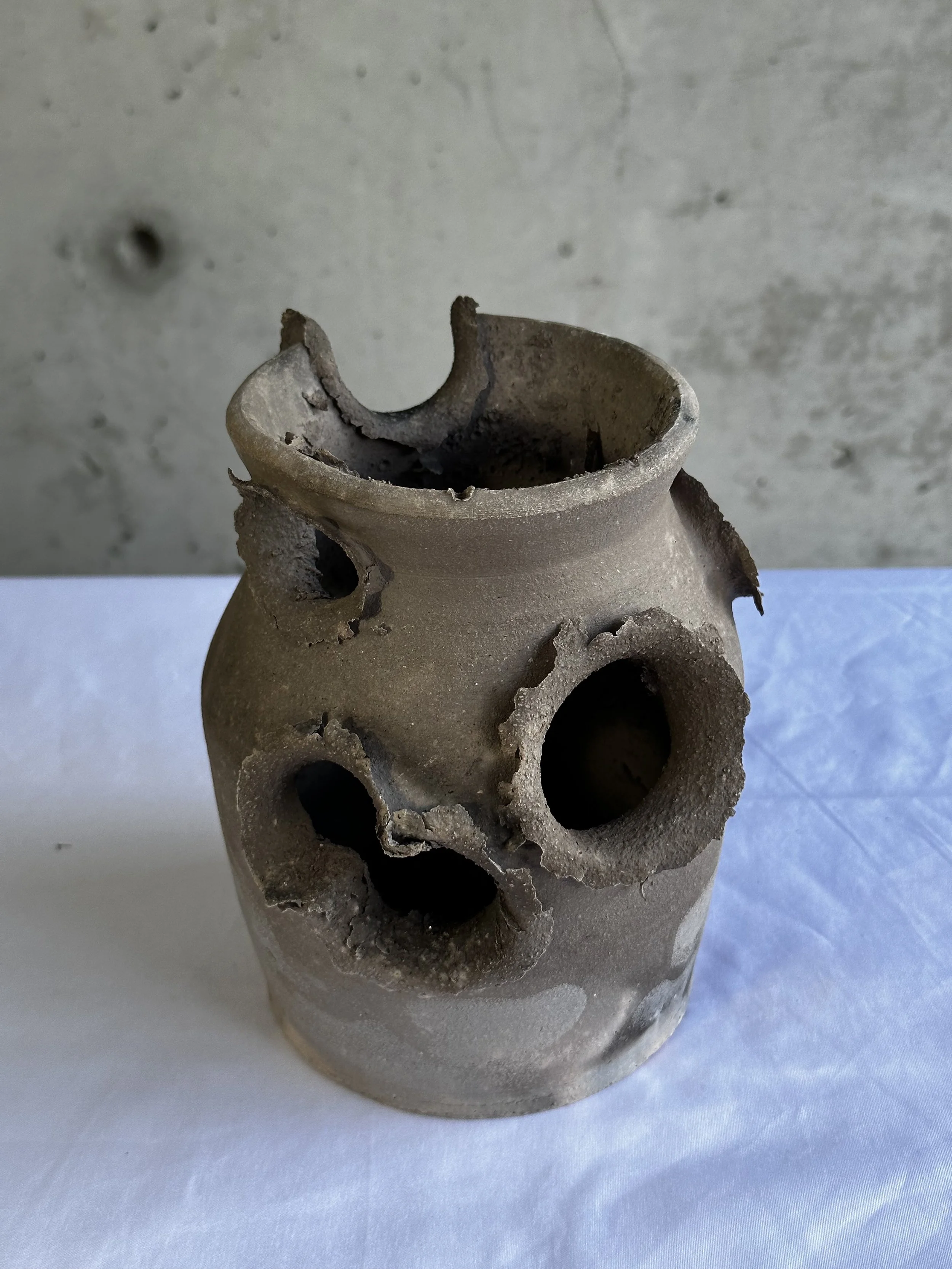 A small urn shaped vase thrown and shot four times with a 9mm handgun. A wide range of damage from bullet holes is shown on the piece.